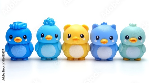 Fototapeta premium Sadness array five adorable cartoon birds different color expressions big eyes little beak cute design studio shot clean background row