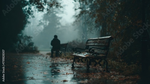 © Pavel, Obraz premium Sadness envelops a man sitting alone on a park bench under gray skies during a rainy autumn day in a quiet, abandoned area of the city