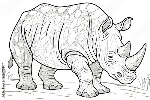 © Jenjira, Fototapeta premium Safari animal theme, Outlined rhinoceros with unique patterns in a natural setting. Outline for coloring