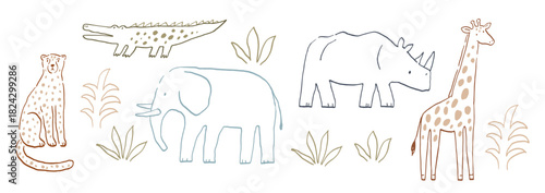 Obraz premium Safari animals cute illustration in doodl style. Outline hand drawn print. African wild animals character
