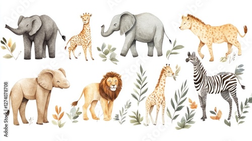 © Mufarokah, Naklejka premium Safari animals watercolor illustration, nursery decor