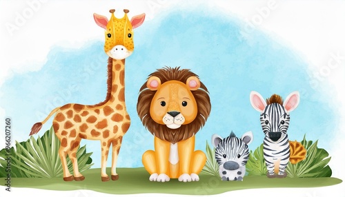 © kardelen, Naklejka premium Safari animals watercolor templates illustration for nursery and baby shower with lion, giraffe and zebra