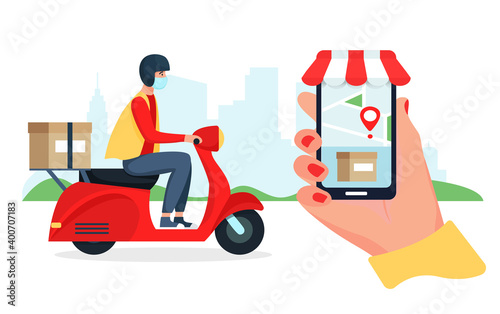Obraz premium Safe delivery concept, delivery man on red scooter, moped, motorcycle. Vector illustration in flat style