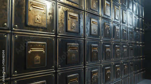 Fototapeta premium Safe deposit boxes and realistic lockers for safe keeping in 3D, A group of steel vaults with code locks for personal use in subterranean or basement storage