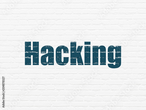 © Maksim Kabakou, Obraz premium Safety concept: Painted blue text Hacking on White Brick wall background