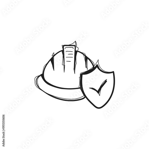 Fototapeta premium Safety Hard Hat with Shield Checkmark Hand Drawn Doodle Vector