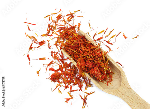 © Yü Lan, Naklejka premium Saffron in wooden scoop on white background