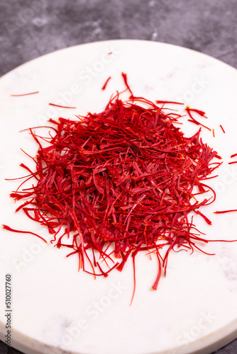 © enezselvi, Naklejka premium Saffron on a dark background. Close-up. Iranian or Persian saffron