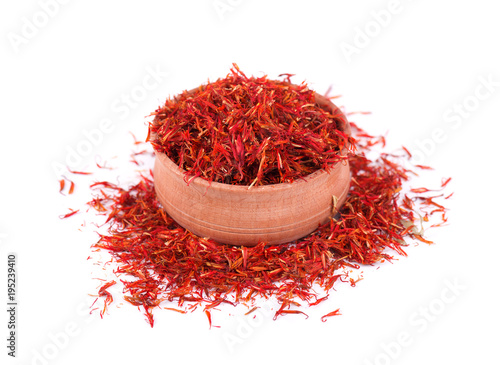 © vandycandy, Naklejka premium Saffron spice in wood bowl isolated on white background