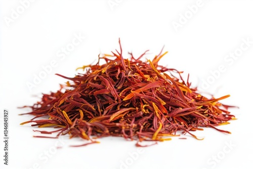 © Nutty, Naklejka premium Saffron threads close up vibrant spice on pure white background studio shot aromatic culinary essence