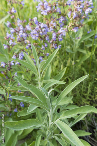 Obraz premium Sage leaves with flowering sage background.