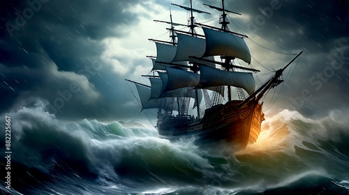 Naklejka premium Sail ship braving the waves of a wild stormy sea at night