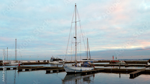 © SPAC, Fototapeta premium Sailboat anchored in harbor with cloudy sky and other boats during sunset