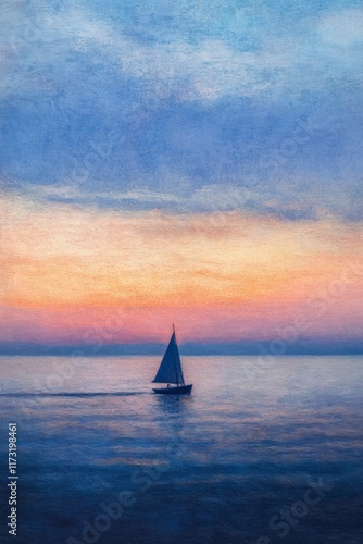 Fototapeta premium Sailboat at sunset on calm ocean waters with vibrant sky colors