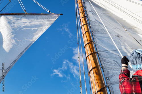 © Crin, Obraz premium Sailboat crew raising white canvas sail. View looking up