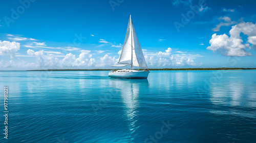 Obraz premium Sailboat cruising on calm blue waters under a clear sunny sky in the Caribbean