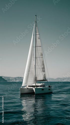 Obraz premium Sailboat glides across reflective blue water beneath a clear sky Vertical...