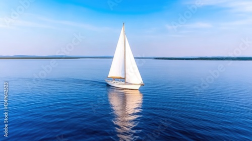 Obraz premium Sailboat glides across serene water. Clear sky and calm waters reflect the vessel