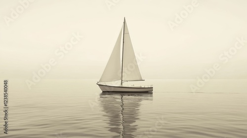 Fototapeta premium Sailboat gliding on calm sea, misty background, peaceful scene, travel imagery