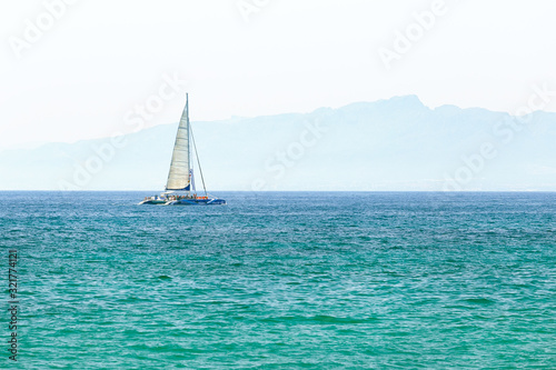 © Sergey, Obraz premium Sailboat in the sea in the sunlight over beautiful mountains background. Freedom concept.