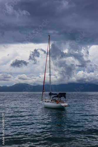 © Anatolii Tershak, Naklejka premium Sailboat off the coast with dramatic clouds in the background. Adriatic Sea, Croatia