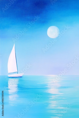 Obraz premium Sailboat on calm ocean waters under a full moon, serene night sky with blue...