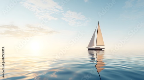© Supatinee, Fototapeta premium Sailboat on Calm Sea at Sunset with Soft Clouds and Golden Light