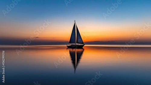 Fototapeta premium Sailboat on calm water at sunset, vibrant sky reflecting on the glassy surface.