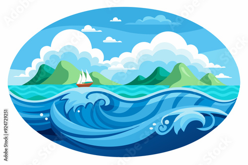 Fototapeta premium Sailboat on Ocean with Mountains and Clouds in Circular Frame