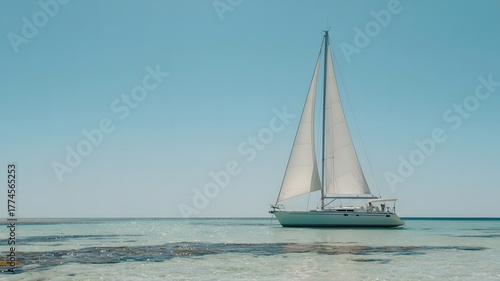 Fototapeta premium Sailboat on shallow turquoise water with clear blue sky backgrou