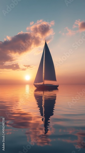 Fototapeta premium Sailboat on tranquil waters: sunset serenity with clean modern design perfect...