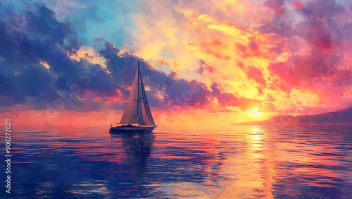 Fototapeta premium Sailboat - sailboat, ocean, sunset, clouds, water, sky, horizon, colorful, sailing, calm, reflection, scenic, sea, vessel, serene, tranquility, marine, pastel
