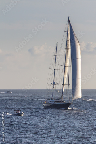 © robertdering, Obraz premium Sailboat sailing in the evening