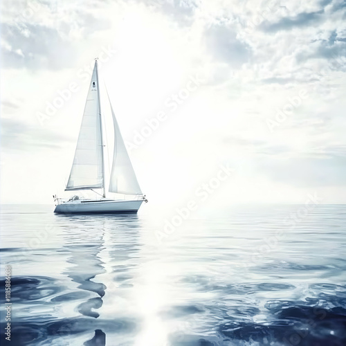 © Siasart, Fototapeta premium Sailboat Sails Calmly on Ocean Reflecting Clouds Serenely