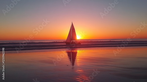 © Almahyra, Fototapeta premium Sailboat silhouetted against a vibrant sunset over calm ocean waters, reflecting on the wet sand.