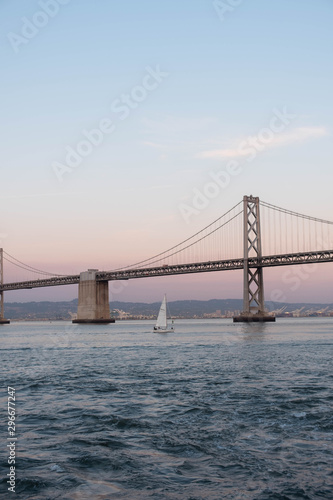 © Daniel, Naklejka premium Sailboat under the bay bridge at dusk