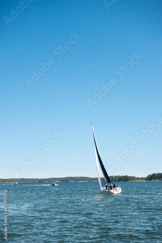 © Nicholas, Naklejka premium Sailboat with black sails on adventurous sailing holiday in picturesque archipelago landscape by the coast in Sweden, Scandinavia