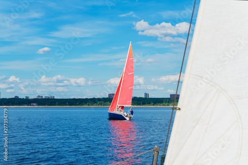 © Evgeny, Naklejka premium sailboat with red sails on the background of the shore with an urban landscape