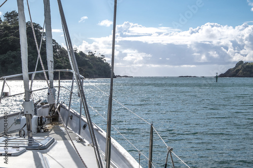 © corners74, Obraz premium Sailboat yacht motoring out of Tutukaka Harbour between rocks and navigational channel marker in Northland, New Zealand, NZ