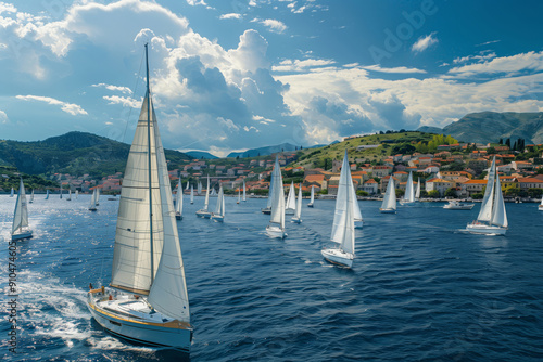 Obraz premium Sailboats Gracefully Departing for Regatta Amidst Stunning Coastal Landscape...