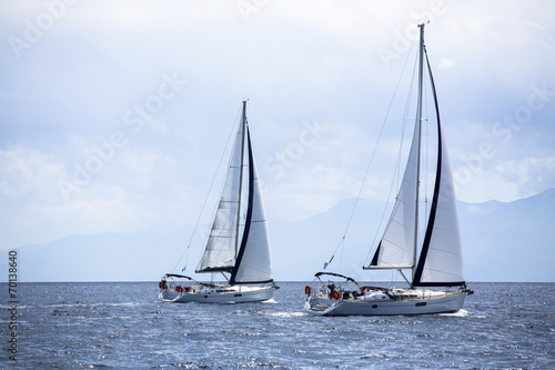 Fototapeta premium Sailboats in front of the regatta in the morning mist.