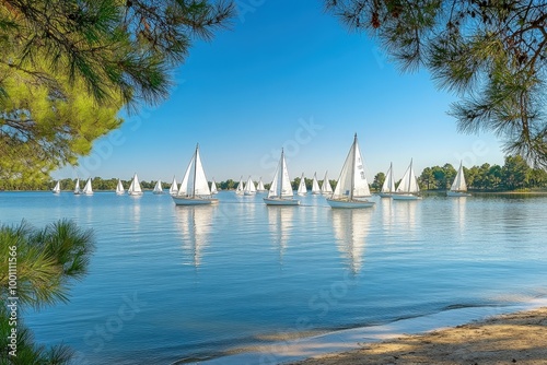 Obraz premium Sailboats on a serene lake surrounded by pine trees