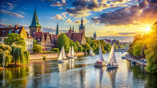 Naklejka premium Sailboats on River, Summer Day, Scenic View, Architectural Photography