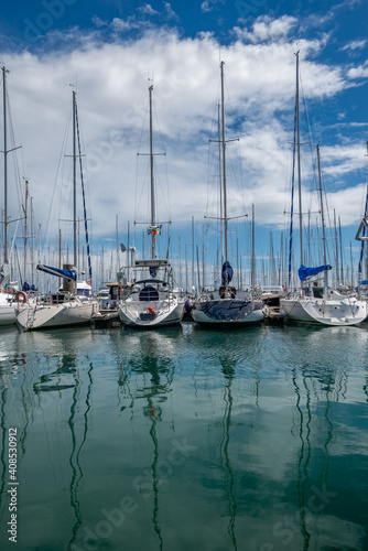© Ok More Photos, Fototapeta premium Sailboats reflection at french harbor