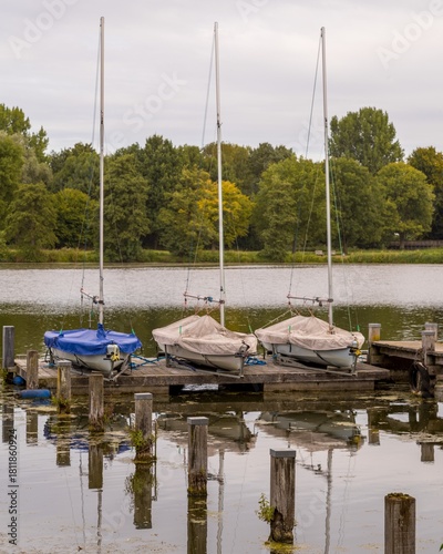 © Ulrich, Fototapeta premium Sailboats resting on a wooden dock in serene lake setting