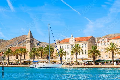 © pkazmierczak, Fototapeta premium Sailing boat anchoring in Trogir town with historic buildings in background, Dalmatia, Croatia