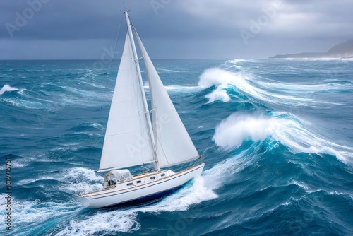 Naklejka premium Sailing boat braving the waves of a stormy sea near the coast