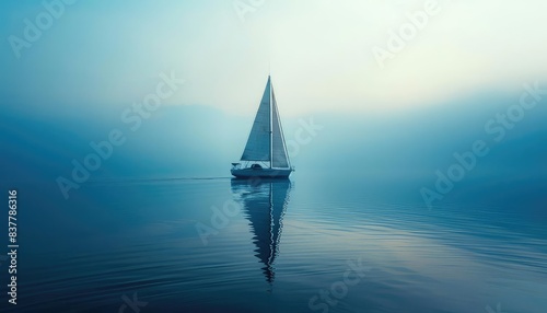 Fototapeta premium Sailing boat, calm sea, horizon view close up, focus on, copy space, tranquil and blue, Double exposure silhouette with sailboat