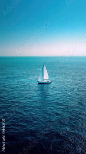 Fototapeta premium Sailing boat floats in endless blue ocean expanse