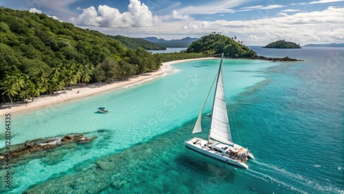 Obraz premium Sailing boat gliding through the crystal-clear turquoise waters of a tropical...